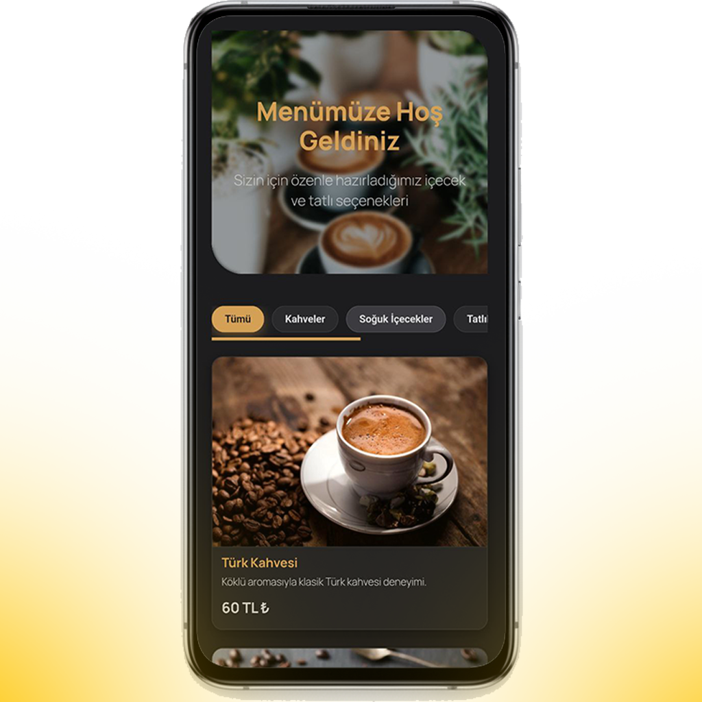 QR kodu okutan müşterileriniz saniyeler içinde sade, şık ve mobil uyumlu bir menüye ulaşır. Karanlık tema uyumu sayesinde her ekranda premium durur.